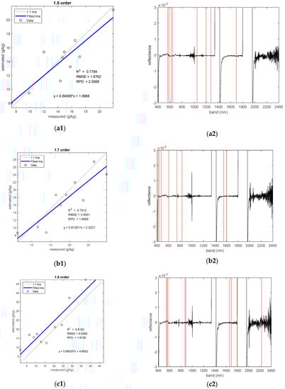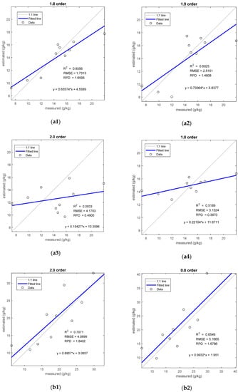 The comparison model based on the linear PLSR is shown in Figure 5a1,b1,c1. The fitting line of the data points has a high degree of coincidence with the 1:1 line, and the R-FOD-CC5-PLSR model also performs well in the fitting effect of I, II, and III Zone. The coefficients of determination of the fitting equations are 0.8556, 0.7071 and 0.8608, respectively, and the fitting equations are, respectively, y = 0.65574 ∗ x + 4.5589, y = 0.8957 ∗ x + 3.0857, and y = 0.78855 ∗ x + 6.2857.
