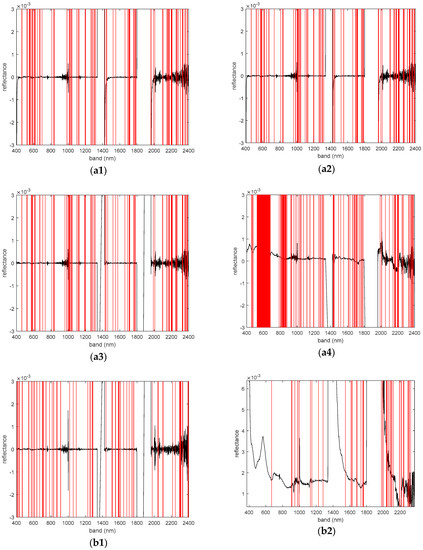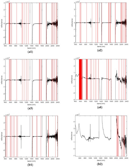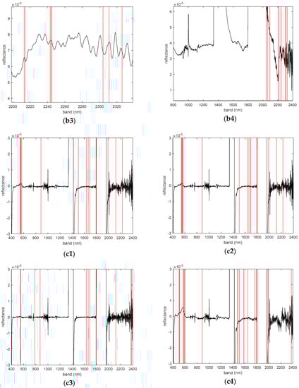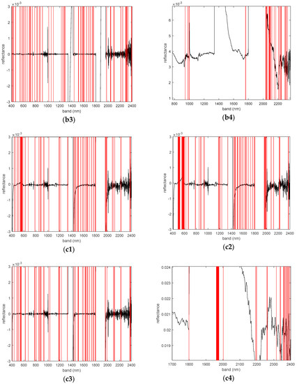 It can be seen from Figure 9a2–c2 that the characteristic bands of the three regions are mainly concentrated in visible light and near infrared. For example, I Zone appears around 618 nm and 1275 nm, II Zone appears around 469 nm and 744 nm, and III Zone appears around 555 nm and 872 nm.