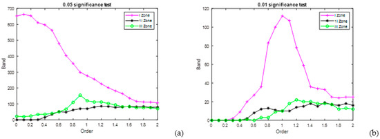 The optimization of spectral variables is necessary for soil hyperspectral analysis, which can not only reduce the complexity of the prediction model, but also remove low-correlation band variables. It is a key link to improve modeling accuracy. However, the modeling accuracy of different characteristic band selection methods is different. The number of characteristic band variables extracted by the three different methods (R-FOD-FULL, R-FOD-CC5, and R-FOD-CC1) in different research zones is quite different. Since the R-FOD-FULL method uses full band variables, there are 1759 band variables in each fractional-order, so it is not shown in the Figure. Figure 10 shows the number of characteristic band variables extracted based on different methods in each zone. Among them, R-FOD-CC5 represents the band variable that passed the 0.05 significance level test in different FOD, and R-FOD-CC1 represents the band variable that passed the 0.01 significance level test in different FOD. Figure 10a reflects that the number of characteristic band variables extracted by the R-FOD-CC5 method shows a gradual decrease trend in 1 Zone as a whole, while the change trend in II Zone and III Zone increases first and then decreases. Figure 10b reflects that the overall change trend of the number of characteristic band variables selected by the R-FOD-CC1 method in each zone is increased first and then decreased.