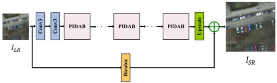 where denotes two convolutional layers with a kernel size of 3 × 3 to extract C initial feature maps. The resulting contributes to the next deep feature-extraction part using the PIDABs. Moreover, the proposed PIDAB can be regarded as a basic component for residual feature extraction. The operation of the n-th PIDAB can be defined as: