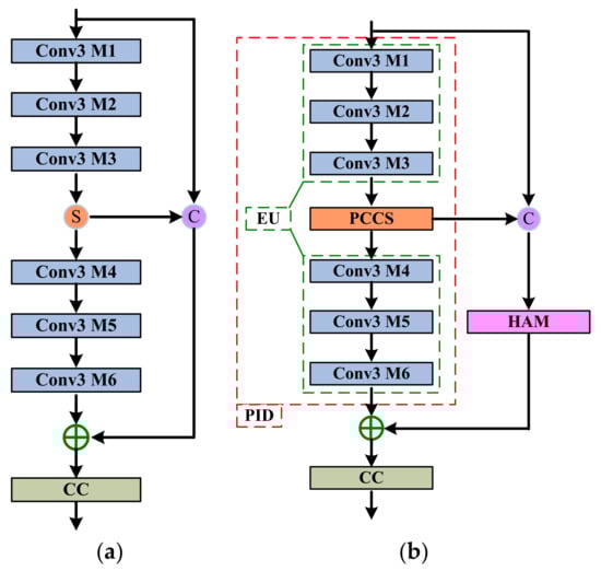 As shown in Figure 2b, the PID module consists of two parts: An EU and a PCCS component. The EU can be roughly divided into two modules, the upper shallow convolution network and the lower shallow convolution network. Each module has three cascaded convolutional layers with a convolution kernel size of 3 × 3; each of these is followed by a leaky rectified linear unit (LReLU) activation function, which is omitted here. We label the feature map dimensions of the i-th layer as , and the relationship among the upper three convolutions can be formulated as: