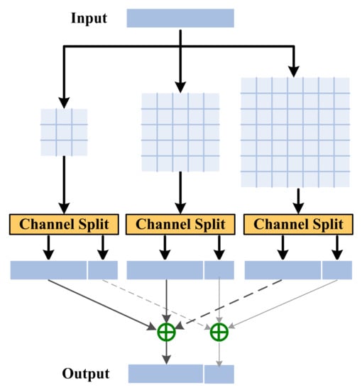 For a PCCS component, assuming that the given input feature map is , the pyramid convolution layer operation is applied to the extraction of refined features with different kernel sizes. The split operation is performed after each feature-refinement branch, and this can split the channel into two parts. The process can be formulated as: