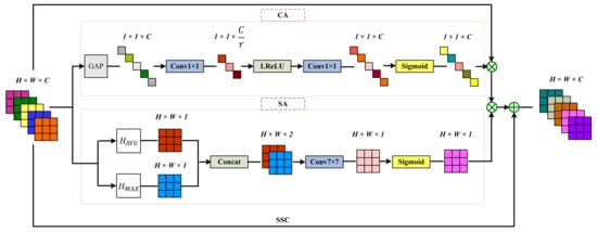 where: F denotes the input of the HAM; and CAM(·), SAM(·), and HAM(·) respectively denote the CAM, SAM, and HAM functions. Here ⮾ denotes element-wise multiplication between the CAM and SAM functions. Like an RCAN, short-skip connections are added to enable the network to directly learn more complex high-frequency information while improving the ease of model training. The structure of the HAM is presented in Figure 4.