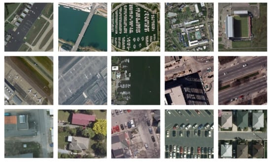 Examples of images in the three remote sensing datasets. In order, the top–bottom lines show samples from the AID, NWPU VHR-10, and COWC datasets.