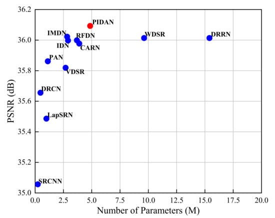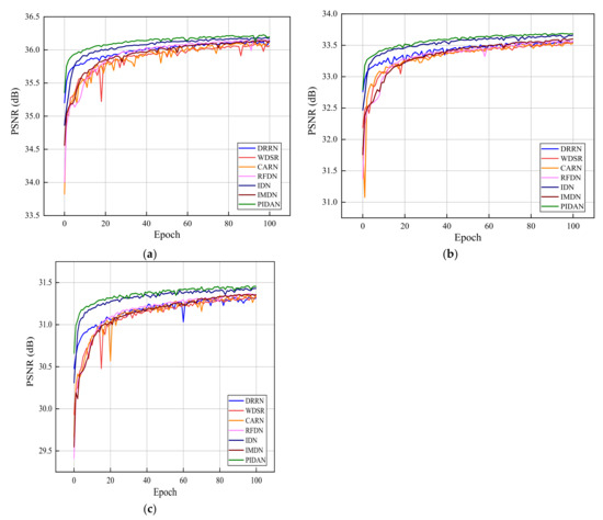 Figure 6 shows a comparison of the PSNR values between the PIDAN and DRRN, WDSR, CARN, RFDN, IDN, and IMDN networks using the FastTest10 dataset in the epoch range of 0 to 100. Compared to the other methods, the PIDAN converges faster and achieves better accuracy.