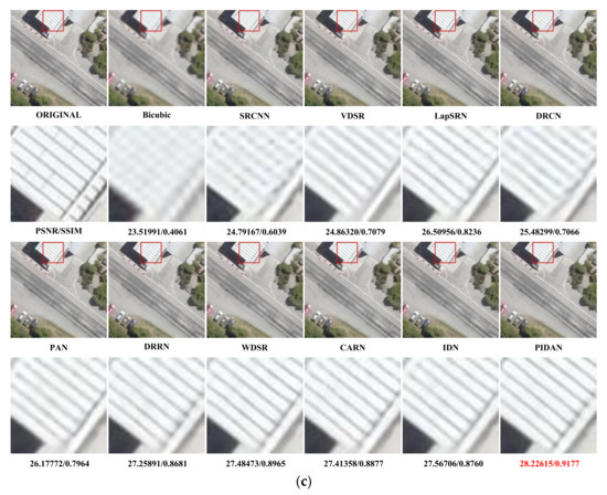 We compared our PIDAN with the bicubic interpolation, SRCNN [9], very deep super resolution (VDSR) [10], LapSRN [26], DRCN [24], pixel attention network (PAN) [39], DRRN [25], WDSR [29], CARN [30], residual feature distillation network (RFDN) [48], IDN [18], and IMDN [38] approaches. Specifically, for a fair comparison, the number of PIDABs was set to four in line with the IDN approach. Table 2 shows quantitative comparisons using the NWPU VHR-10 and COWC datasets. The best performances are indicated in bold, and the second-best performances are indicated with an underline. Our PIDAN performed better than all other approaches in most datasets with upscaling factors of ×2, ×3, and ×4.