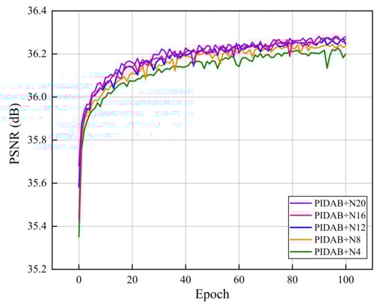 In this subsection, we report the results of adjusting the depth of the network by simply increasing the number of PIDAB. Specifically, numbers of PIDABs ranging from 4 to 20 were used. Figure 9 shows the performance with different numbers of PIDABs using the FastTest10 dataset in the epoch range 0 to 100. When simply increasing the value of N to 20, the improvement increases, and a gain of approximately 0.08 dB is achieved when compared to the basic network (N = 4) with a scaling factor of ×2, which demonstrates that the PIDAN can achieve a higher average PSNR with a larger number of PIDABs.