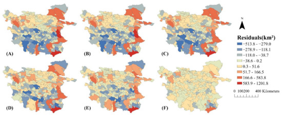 Average residuals of the (A) OLS, (B) SEM, (C) SLM, (D) ESF, (E) GWR, and (F) ESF-SVC models for 2000 to 2015.