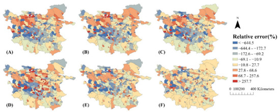 Average relative errors of the (A) OLS, (B) SEM, (C) SLM, (D) ESF, (E) GWR, and (F) ESF-SVC models for 2000 to 2015.