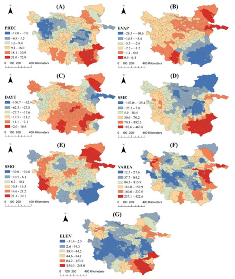 The differences in the spatial distribution of the coefficients of the ESF-SVC model suggest that there are differences in the effects of the factors on the lake area in different regions.