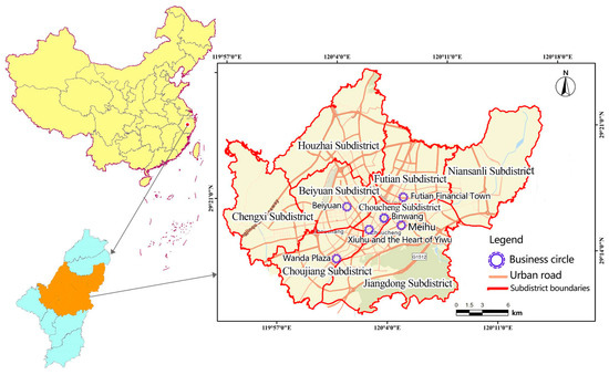 Geographical location and distribution of business circles in the main urban area of Yiwu city.