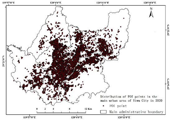 Distribution of POI points in the main urban area of Yiwu city in 2020.