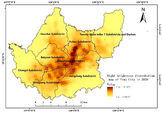 Night-time light brightness distribution map of Yiwu city in 2020.