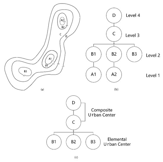 The spatial hierarchical structure can be identified using the local contour tree method. The algorithm includes three steps: locating the “seed” contour, generating a local contour tree, and simplifying the contour tree. As shown in Figure 6a, the highest value contours α1, α2, and α3 of the local area are used as “seed” contours, and then regular contours are continuously constructed outwards until the contours α7. In the same way, the contours formed by the expansion of other seeds are constructed to generate a local contour tree (Figure 6b). According to whether there are branches, the hierarchy is divided to highlight the differences within the tree’s hierarchy (Figure 6c). A1 and A2 are first-level nodes, B1, B2, and B3 are second-level nodes. First-level and second-level nodes are regarded as urban centres, and third-level and above nodes are composite urban centres. This sample area has three basic urban centres (B1, B2, and B3), which are contained in a larger composite urban centre (C).