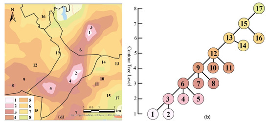 - Cui, T.; Liu, J.; Li, W.; Xu, S.; Luo, A. Research on extraction of multiple commerce center based on contour tree method. Sci. Surv. Mapp. 2020, 45, 150–155. (In Chinese) [Google Scholar]