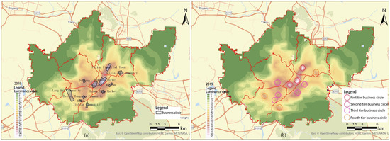 Another contribution of this paper is that we distinguish the hierarchical structure of business circles and analyse their relationship with regards to night-time economic development. Due to the relatively single data source (POI data or noctilucent remote sensing data), some scholars failed to correlate the hierarchical structure of urban business circles with night-time economic development [19,20,23,24,25,26,27,28,31,33]. Previous studies only focused on the identification or geographical distribution of business circles without further analysis of the hierarchical structure of business circles [20,24,25,26,27]. Other scholars only used quantitative research methods to identify business circles based on other data sources, such as check-in data for social networking services and location services [20] or mobile location data [49].