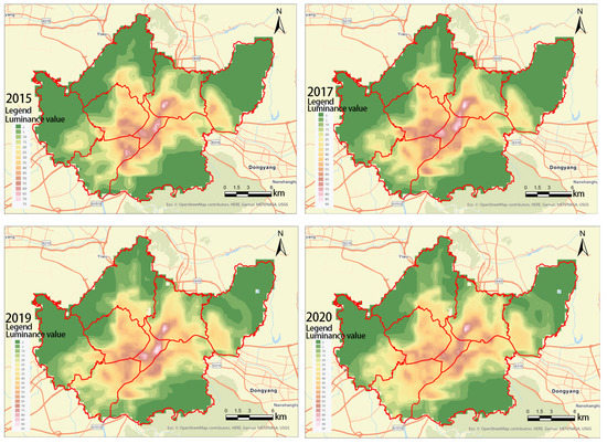 The NPP-VIIRS night-time light data come from the National Oceanic and Atmospheric Administration (https://doi.org/10.7910/DVN/YGIVCD. Accessed on 7 August 2021). We selected the data from 2015 to 2020 as the basic data of this study. Through cropping and projection transformation processing, the resolution is set to 300 m, and the night-time light data of Yiwu city were obtained (Figure 3). To avoid the influence caused by the deformation of the image grid, the image coordinate system was converted to Lambert projection.