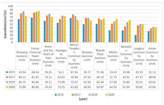 The average brightness of night lights in various business circles in Yiwu city in 2015, 2017, 2019 and 2020.