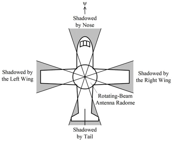 When the airborne scatterometer with the rotating-beam antenna is mounted at the bottom or under the fuselage, the whole 360° azimuthal NRCS observation is available, and the sea wind retrieval can be performed with System of Equation (2). Unfortunately, mounting the rotating-beam radar over the fuselage does not provide the whole 360° azimuthal NRCS observation of the underlying surface at the medium incidence angles of scatterometers (which approximately are between 25° and 65°) as some azimuth directions are shadowed by the aircraft’s nose, tail, and wings (Figure 1).