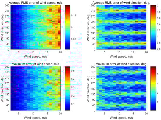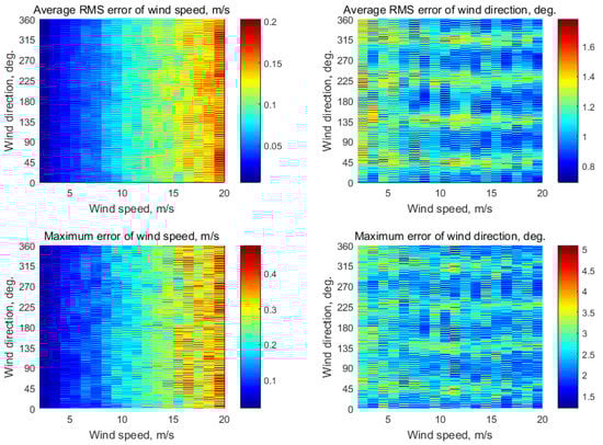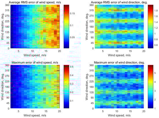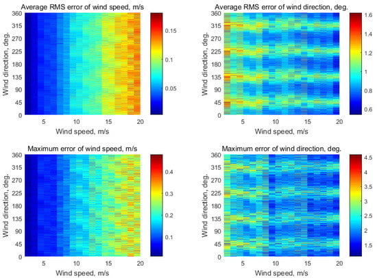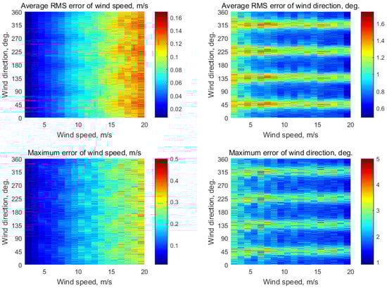 At the same time, the results for the narrow, medium, and wide cases at the incidence angle of 60° are shown in Figure 5, Figure 6 and Figure 7, respectively. In the narrow case, the maximum errors of retrieval of the wind speed and direction are 0.49 m/s and 4.6° (Figure 5). At the medium width, the maximum errors are a little bit higher and are 0.5 m/s and 5.0° (Figure 6). And, when the nose, tail, and wings are wide, the maximum errors are almost the same values of 0.49 m/s and 5.4° (Figure 7). The average RMS error of the wind speed and direction also for the cases considered are presented in appropriate figures. They also have low values: about 0.18 m/s and 1.6° in the narrow case (Figure 5), 0.17 m/s and 1.7° in the medium case (Figure 6), and 0.16 m/s and 1.7° in the wide case (Figure 7) that also demonstrate the quality of the wind retrieval.