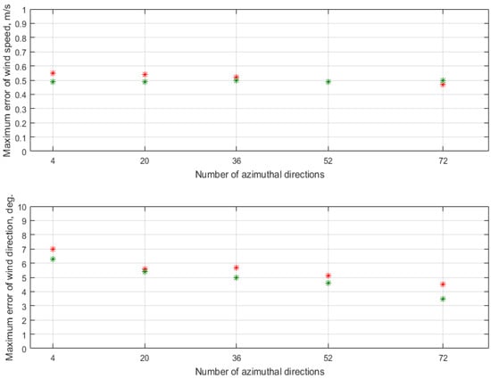 Comparative results of the maximum wind retrieval errors in the case of the whole 360° azimuthal NRCS curve available (N = 72), in the cases of the narrow, medium, and wide nose, tail, and wings (N = 52, 36, and 20, respectively), and in the case when only four azimuth sectors at the directions of 45°, 135°, 225°, and 315° are evadible: red asterisks are for the incidence angle of 45°, and green asterisks are for the incidence angle of 60°.