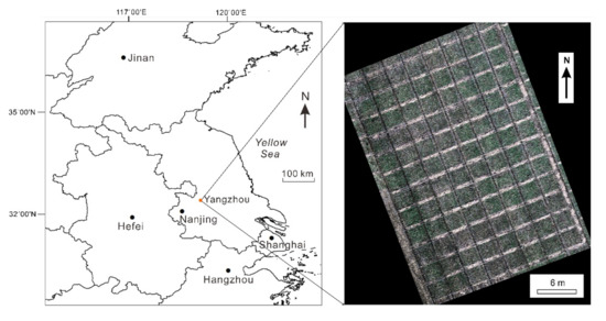 Wheat is one of the three major food crops in China. Jiangsu Province, located in the lower reaches of the Yangtze River, is one of the major wheat production areas in China. In recent years, the delay in rice maturity in this region has led to a significant delay in subsequent winter wheat sowing. For example, the percentages of late-sown (seven or more days later than local normal seed sowing date) wheat area in Jiangsu Province were 48.6%, 51.2%, and 59.6% in 2015, 2016, and 2017, respectively [1]. The delay in sowing has become a major obstacle to high wheat yield; therefore, it is necessary to screen wheat varieties suitable for late sowing. For example, optimal wheat varieties should be able to maintain a certain amount of growth even at the overwintering stage [2]. In addition, wheat in the lower reach of the Yangtze River often suffers from low-temperature frost damage at the overwintering stage, which severely affects wheat growth and development [3]; hence, good wheat varieties should have strong resistance to low temperatures. Therefore, accurately monitoring wheat growth status at the overwintering stage is critical for late-sown winter wheat variety screening.