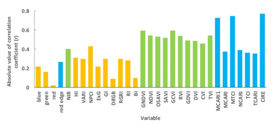 Absolute values of correlation coefficients (r) between the variables (Table 2) and SPAD values of wheat canopy. The orange colour represents the variables that included only the visible spectral bands, the green colour represents the variables that included the near-infrared spectral band but not the red edge spectral band, and the blue colour represents the variables that included the red edge spectral band.
