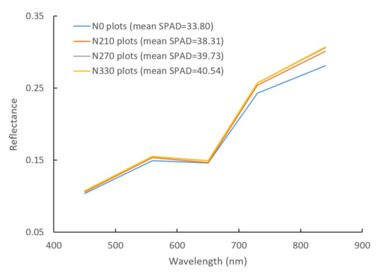 Comparison of spectral curves for varying SPAD values. The SPAD and spectral reflectance values are averaged for the plots under four different rates of nitrogen fertilization (i.e., N0: 0 kg ha−1, N210: 210 kg ha−1, N270: 270 kg ha−1, and N330: 330 kg ha−1 pure nitrogen), respectively. In general, reflectance increases with increasing SPAD, especially in the red edge and near-infrared regions.