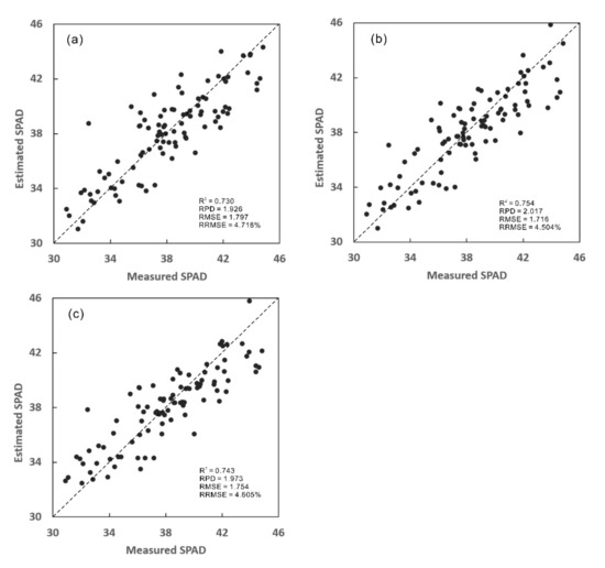To further analyze the modeling accuracy, Figure 5 presents the scatterplots of the measured SPAD against the estimated SPAD by the LOOCV, when the three models that achieved the best estimation performance were applied. For all three models, the data points are well distributed along the 1:1 relationship, demonstrating good agreements between the measured and estimated SPAD values.