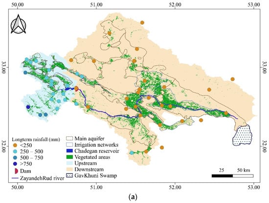 The ZRB covers an area of 26,917 km2 (Figure 1). The main river of the ZRB flows for 350 km from the Zagros Mountains to the Gavkhuni Swamp [45]. The Zayandehrud dam is the main reservoir and plays a key role in regulating the water supply [46]. Precipitation data from 53 stations (2003 to 2018, data were obtained from the Islamic Republic of Iran Meteorological Organization (IRIMO)) demonstrate that the average precipitation varies from 63 mm in the eastern part to 1281 mm in the western part (Figure 1a). Precipitation occurs mainly from November to April. The mean annual temperature is 14.2 °C. The elevation of the study area varies from 1442 m to 3927 m. According to the Isfahan Agricultural Organization (IAO), more than 40 different crops are cultivated in the region, with wheat, barley, alfalfa, maize, potatoes, onions, and rice being the main staple crops. Owing to the low precipitation in the eastern and central parts of the ZRB, irrigated agriculture is dominant. Water paucity, drought, and low rainfall are the main challenges in the ZRB, and these have resulted in fewer water releases from the dam downstream of the ZRB. In this study, downstream refers to the area from the dam to the Gavkhuni swamp, and from the dam upwards, where it rains more frequently, is referred to as upstream. Twelve counties cover about 92% of the basin’s area and are mainly located in arid and semi-arid regions (Figure 1b, Köppen-Geiger climate zones [47]).