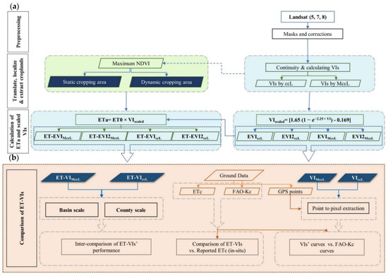 Workflow of ETa calculation. Dark blue cells represent products of this study. (a) ETa and scaled VIs calculation; cyan and green colors are representative of research questions a and b. (b) evaluation methods; light pink shows research questions c and d. VI: vegetation index, ET: evapotranspiration, EVI2MccL and EVIMccL: 2- and 3-band Enhanced Vegetation Index (MODIS continuity-corrected Landsat) respectively; EVI2ccL and EVIccL: 2- and 3-band Enhanced Vegetation Index (continuity-corrected Landsat) respectively.
