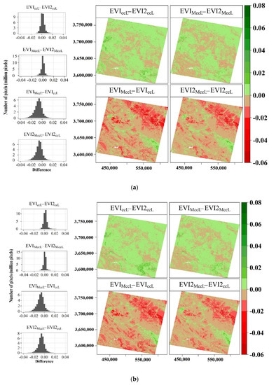Calculated VIs were compared on two dates, 14 June 2002 and 1 August 2008, in four combinations (EVIccL–EVI2ccL, EVIMccL–EVI2MccL, EVIMccL–EVIccL, and EVI2MccL–EVI2ccL). Both difference maps and difference frequency histograms of EVIccL and EVIMccL were higher over dense vegetation (Figure 3). ET-EVI2ccL and EVI2MccL presented slightly lower values than corresponding EVI values, particularly over bare soil and mountainous regions. The highest and lowest estimated values belonged to EVIccL and EVI2MccL, respectively, as evidenced by histograms. The peak of the EVIMccL–EVIccL and EVI2MccL–EVI2ccL histograms shifted to more negative values compared to that of the EVIccL–EVI2ccL and EVIMccL–EVI2MccL. In some parts of sparsely vegetated areas, the EVI2MccL and EVI2ccL values were slightly larger than EVI values. While these differences are still well within the expected noise in the VI dynamic range, [31] explained that EVI2 values are somewhat higher than EVI values due to the higher ratio of B/R in the EVI equation.