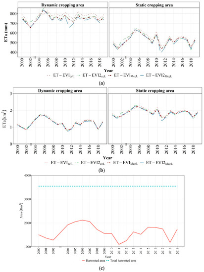 (a) Mean ETa estimated using the distinct VIs in millimeter considering static and dynamic harvested areas, (b) Total ETa estimated using the distinct VIs in cubic kilometer considering static and dynamic harvested areas, (c) red: annual cropland extent vs. blue: static harvested area (area harvested at least once). ET-EVI2MccL and ET-EVIMccL: ET calculated using 2- and 3-band Enhanced Vegetation Index (MODIS continuity-corrected Landsat) respectively; ET-EVI2ccL and ET-EVIccL: ET calculated using 2- and 3-band Enhanced Vegetation Index (continuity-corrected Landsat) respectively.