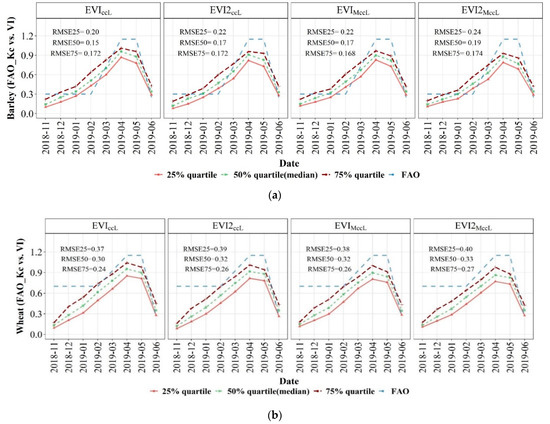 Kc methods are typically derived from crops grown under optimal conditions, whereas actual field crops can be subjected to various limitations and water stress [24,63]. The monthly average of scaled VIs curves versus FAO-Kc at three quartiles for wheat and barley have relatively close RMSE values (Figure 5).