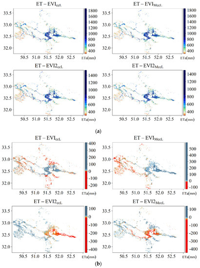(a) Long-term mean ET-VI, and (b) differences between average of all ET-VIs and ET-VIs. ET-EVI2MccL and ET-EVIMccL: ET calculated using 2- and 3-band Enhanced Vegetation Index (MODIS continuity-corrected Landsat) respectively; ET-EVI2ccL and ET-EVIccL: ET calculated using 2- and 3-band Enhanced Vegetation Index (continuity-corrected Landsat) respectively.