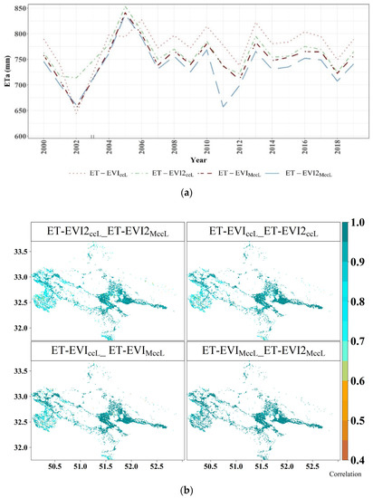 (a) Annual average ET-VIs over the ZRB, (b) Pixel-wise spatial correlation. ET-EVI2MccL and ET-EVIMccL: ET calculated using 2- and 3-band Enhanced Vegetation Index (MODIS continuity-corrected Landsat) respectively; ET-EVI2ccL and ET-EVIccL: ET calculated using 2- and 3-band Enhanced Vegetation Index (continuity-corrected Landsat) respectively.