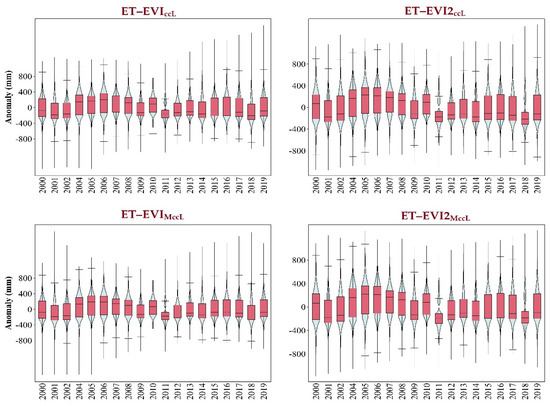 Figure 8 depicts the boxplots of ET-VIs’ anomalies over two decades. All ET-VIs showed similar patterns considering inter-annual variations in ET-VIs anomalies with a capability to capture the drought and shrinkage of agricultural areas.