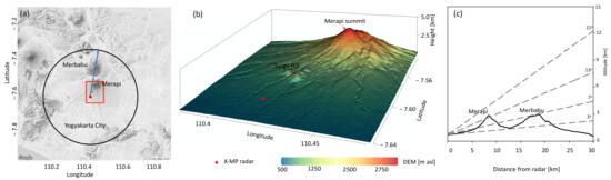 Left panel (a) is a fixed observation area of the PPI scan mode. Centre panel (b) is the 3D view of surface topography of the red square area in (a). Right panel (c) is the vertical profile of radar scan and topography, extracted along the blue arrow in (a). Identified in (a) are locations of Yogyakarta city, Merapi, and Merbabu. The locations of Turgo hill and Merapi summit are pointed by red arrows in (b) and the X-MP radar site is indicated by a red dot in (a,b).