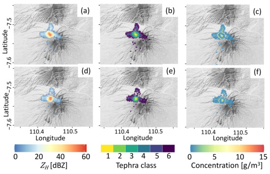 Tephra detection using modified VARR model (Appendix A and Appendix B) for M05 (first row) and M06 (bottom row) at 2 min after the reported eruption onset. From the left, the first column (a,d) is the reflectivity intensity factor, the second column (b,e) is the tephra classes, and the third column (c,f) is the tephra concentration. Tephra classes (b,e) of 1–3 represent the coarse class (C) of light, moderate, and intense concentration, respectively. Tephra classes of 4–6 represent the same tephra concentration, but for the finer class (F).