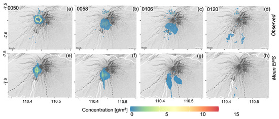 The retrieved tephra concentration on M05 based on valid (a–d) compared with the mean EPS (e–h) at different time steps, as indicated in the top left corner. The mean EPS uses a threshold of tephra concentration ≥ 0.01 g/m3. In each image, the x-axis is longitude and y-axis is latitude.