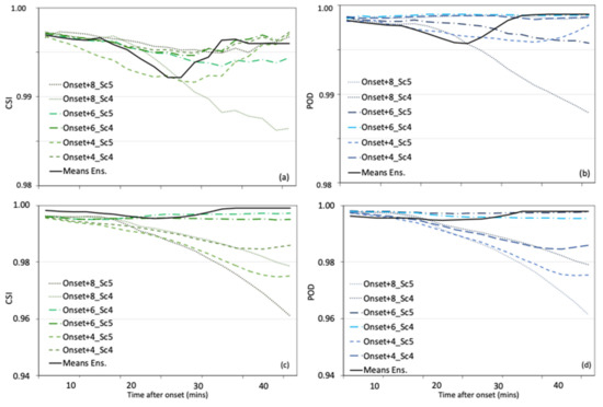 Spaghetti plots of CSI (left) and POD (right) for both study cases. (a,b) M05 and (c,d) M06. The ensemble member was named based on IC: onset+i_Scj, where i and j represent the time in minutes and advection phenomena (Table 2), respectively.
