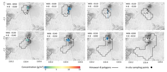 Mean ensemble of tephra concentration and area of detected tephra cloud by Himawari-8 (given by black polygons). The study cases and time stamps are indicated in the top left corner. The detected area of Himawari-8′s tephra cloud was transformed into a polygon using cloud temperature < 285 K. The ground-based data points are also presented in each map, given by black dots. In each image, the x- and y-axis are longitude and latitude, respectively.