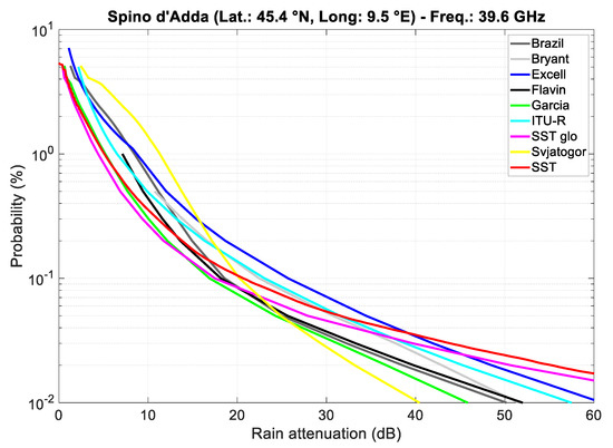 In Figure 1, we show the annual probability distributions (%) of exceeding rain attenuation (dB) in the slant path in Spino d’Adda to a geostationary satellite on the meridian (elevation angle 37.7°, see Table 1) at 39.6 GHz and a circular polarization. Rain attenuation is calculated by using, as input, the rain rate probability distribution recorded locally—with rain rate expressed in millimeters per hour—in the years 1993−2002 (10 years of continuous observation). In other words, we simulate links towards GEO satellites with the highest elevation angle.