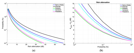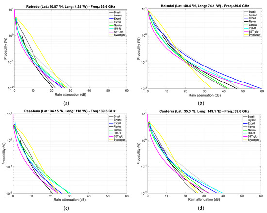 Annual probability distributions (%) of rain attenuation exceeded in the slant paths directed along the local meridian to a Geostationary satellite at 39.6 GHz and a circular polarization in: (a) Robledo (elevation angle 42.8°): (b) Holmdel (elevation angle 43.3°), (c) Pasadena (elevation angle 50.3°), and (d) Canberra (elevation angle 49.0), predicted by using the ITU−R [28,29] rain rate probability distributions.