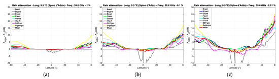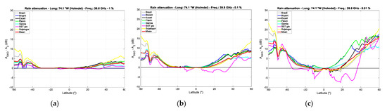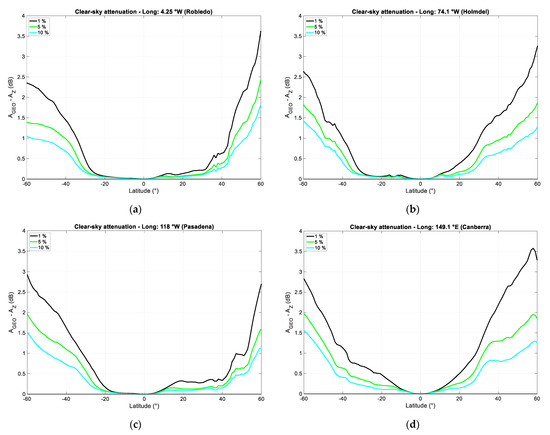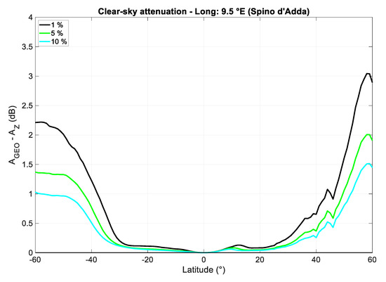 Figure 13 shows the difference , calculated at the fixed annual probabilities of 1%, 5%, and 10%, between the clear-sky attenuation exceed in the GEO path, , and that exceeded in the GeoSurf path, , in the latitude range 60° N to 60° S along the meridian of Spino d’Adda. We can notice that the Northern hemisphere is more attenuated than the Southern one. Now, even if the attenuation is smaller than that due to rain, it is always present because for probabilities below 1%, the values do not significantly change; therefore, for any link design, the values exceeded at 1% should be considered. Figure 14 shows similar results for the other reference sites.