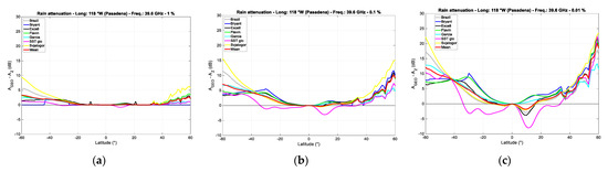 The difference , calculated at fixed annual probabilities 1% (a), 0.1% (b), and 0.01% (c), between the rain attenuation exceed in the GEO path, , and the rain attenuation exceed in the GeoSurf path, , i.e., at the zenith in Pasadena; 39.6 GHz, circular polarization.