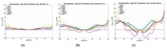 Let us now consider the other reference sites. In Figure 2, we show the probability distributions of rain attenuation predicted for the slant path to a GEO satellite along the meridian of the site, by using the ITU−R rain rate probability distributions as input to the models and its rain height [29]. The elevation angle at each site is reported in Table 1. For comparing, at a glance, the rain attenuation exceeded at the same probability level, the scales are kept fixed for all figures.