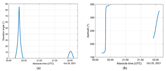As an example, Figure 8 shows the orbits and satellite track on the ground for 6 h (20 October 2021, starting time 20:07:26 UTC). Figure 9 shows two visibility windows, in terms of satellite elevation and azimuth angles, as seen from Spino d’Adda. Considering only elevation angles larger than 20°, there are typically three daily passes with an average duration of approximately 6 minutes and a maximum duration of roughly 7.6 min when reaching the zenith.
