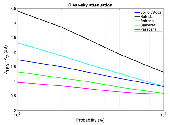 In this section, we consider the total clear-sky attenuation due to water vapor, oxygen, and cloud, calculated with the ITU−R recommendations [32,33] at 39.6 GHz. Figure 12 shows the annual probability distributions predicted in the GEO paths on the local meridian of the reference sites. As for rain attenuation, the attenuation depends on site, with drier sites (Pasadena) being less affected than wetter ones (Holmdel).