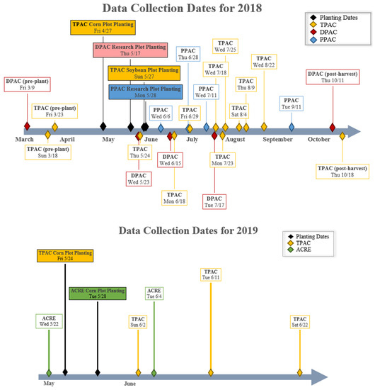 Poaceae virgatum). At ACRE, common dicot weeds included giant ragweed. For the 2018 growing season at TPAC, the soybean research plot was planted on 27 May 2018. Planting began on the TPAC corn plots and the PPAC and DPAC corn and soybean research plots on 27 April, 28 May, and 17 May. A timeline of the UAS data acquisition dates over the 2018 growing season is shown in